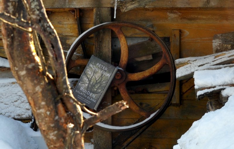 Puiden salattu elämä -kirja puimakoneen hihnapyörällä. Etualalla puu.