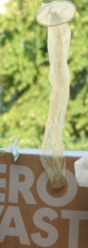 Käytetty kondomi ja Zero waste -kirja, jonka kannessa näkyvät sanat ”ro” ja ”ast”.