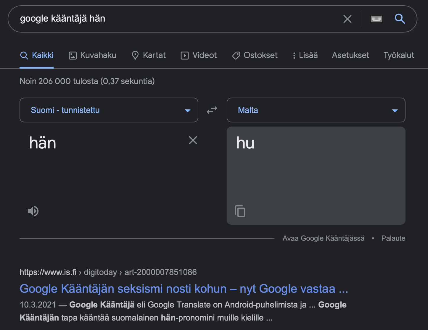 Googlen hakusanoina ”google kääntäjä hän”. Hakutuloksena ”hän” käännettynä maltaksi.
