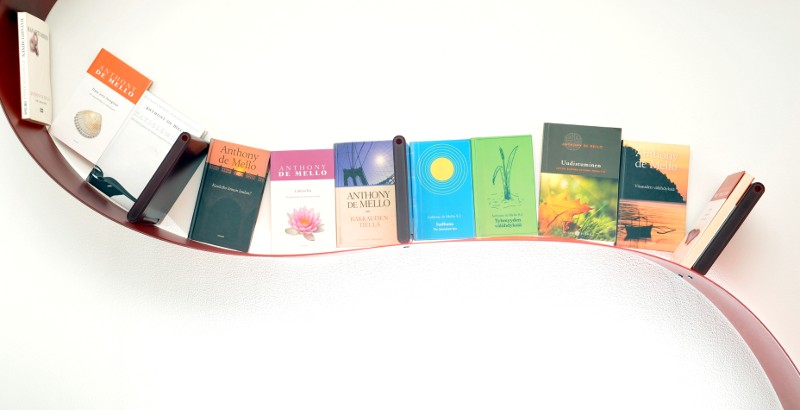 Anthony de Mellon suomenkieliset teokset rivissä punaisessa Bookworm-kirjahyllyssä.