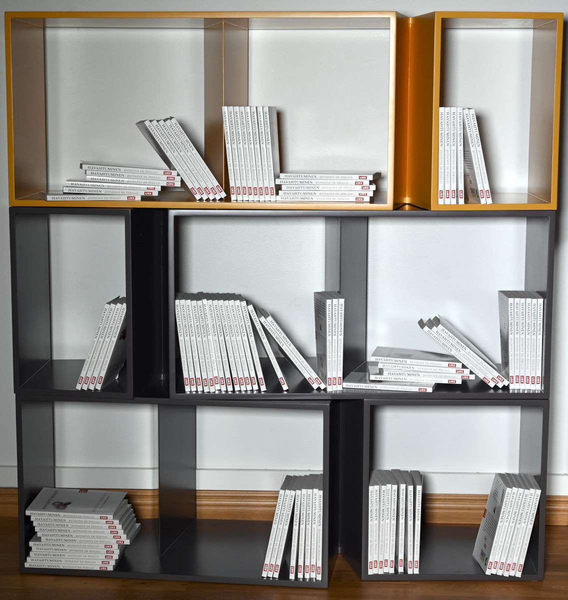Sata Havahtuminen-kirjaa Ligne Roset’n harmaissa ja sinapinkeltaisessa Cuts-kirjahyllyissä.
